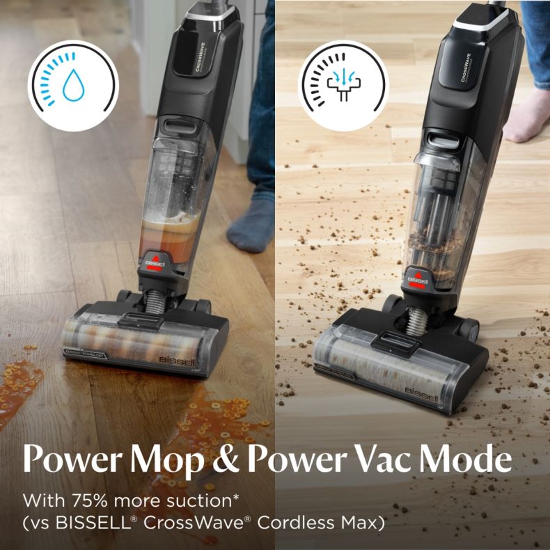 Power through dirt with Power Mop or Power Vac mode - offering 75% more suction than the Bissell CrossWave Cordless Max.