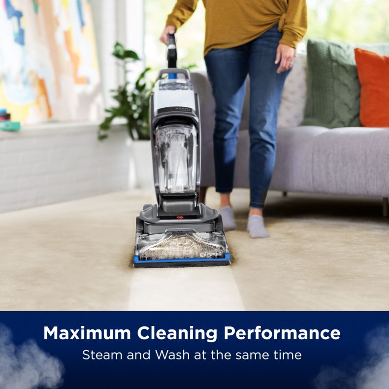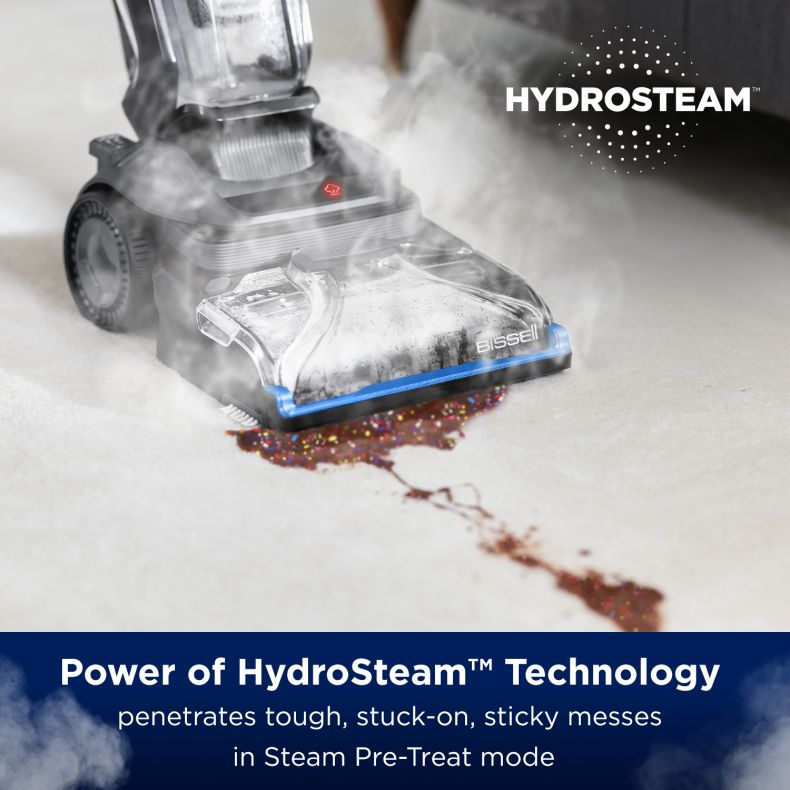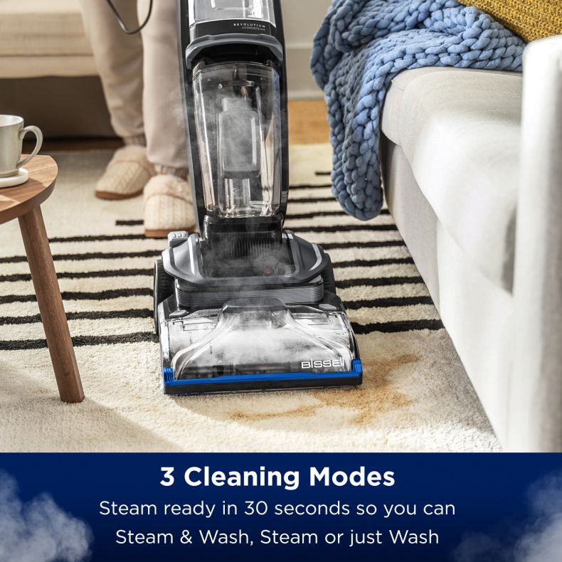 It's never been easier to deep clean carpets with the BISSELL® Revolution™ HydroSteam™ carpet cleaner. It is the ONLY upright deep cleaner with the power of HydroSteam™ to remove the toughest set-in stains, sticky messes, and lingering odours from carpets. Each machine comes with three distinct modes of cleaning - Steam Pretreat Mode, SteamWash™ Max Clean Mode and Quick Dry Mode.