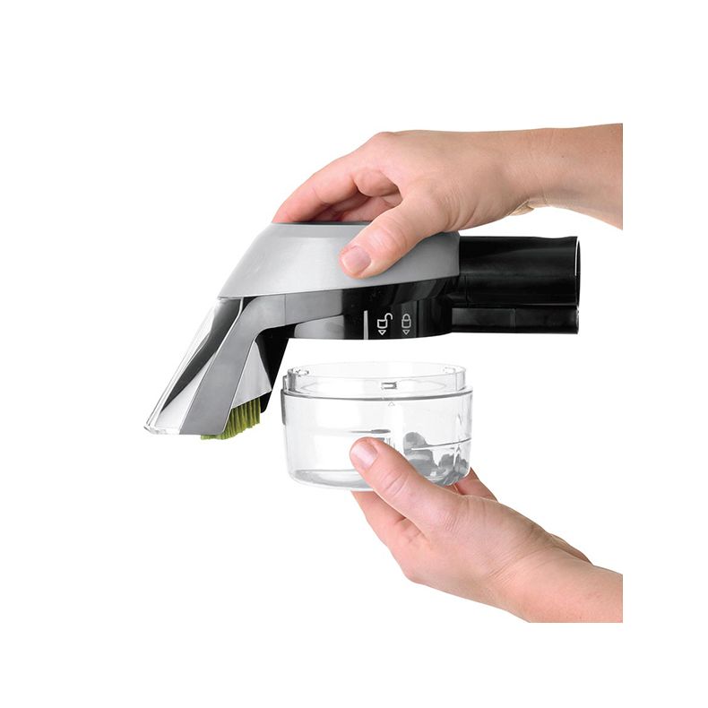 This tool can be attached to your BISSELL carpet cleaner's, or spot cleaner, hose. Set the tool directly on top of the stain you would like to remove, and pull the trigger to spray a mixed solution of formula and water onto that stain. Release the trigger, and gently scrub the stain with brush bristles, to have it completely removed. This tool will store picked up debris into an internal, separate and removable dirt container. In this way you can easily empty it by disposing the dirt container only. The dirt will not end up in the hose or machine, and will keep it clean and easy.