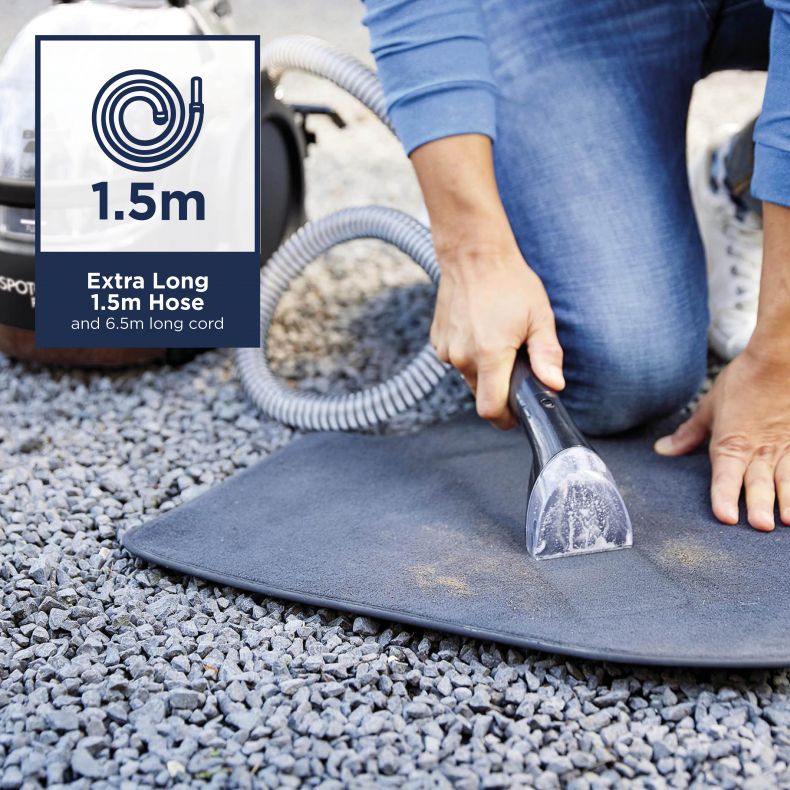 SpotClean Pro™ is our most powerful portable spot cleaner. Use for easy spot and stain cleaning. What makes the SpotClean Pro™ an effective spot cleaner? SpotClean Pro™ combines powerful vacuum suction, brushing action and cleaning solution to remove dirt & stains. Its long hose and power cord let you clean hard to reach areas such as area rugs, stairs & upholstery. The SpotClean Pro™ features a large capacity tank that allows for less frequent trips to the sink!